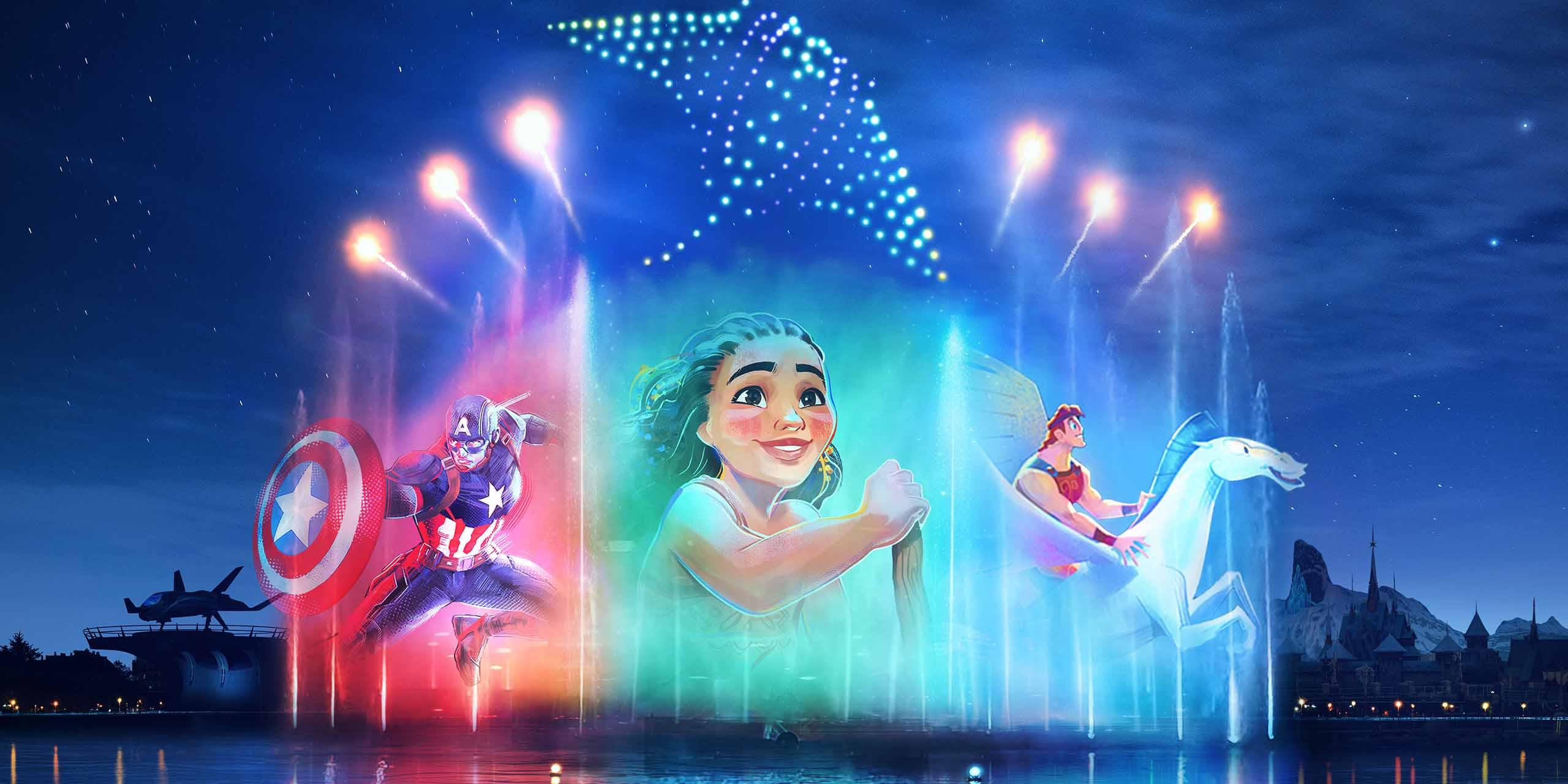 Deze gloednieuwe avondshow verlicht het meer en de wandelboulevard Adventure Way met vuurwerk, projecties op waterschermen, dansende drones en adembenemende visuele effecten zoals je nog nooit in Disneyland® Paris hebt beleefd.