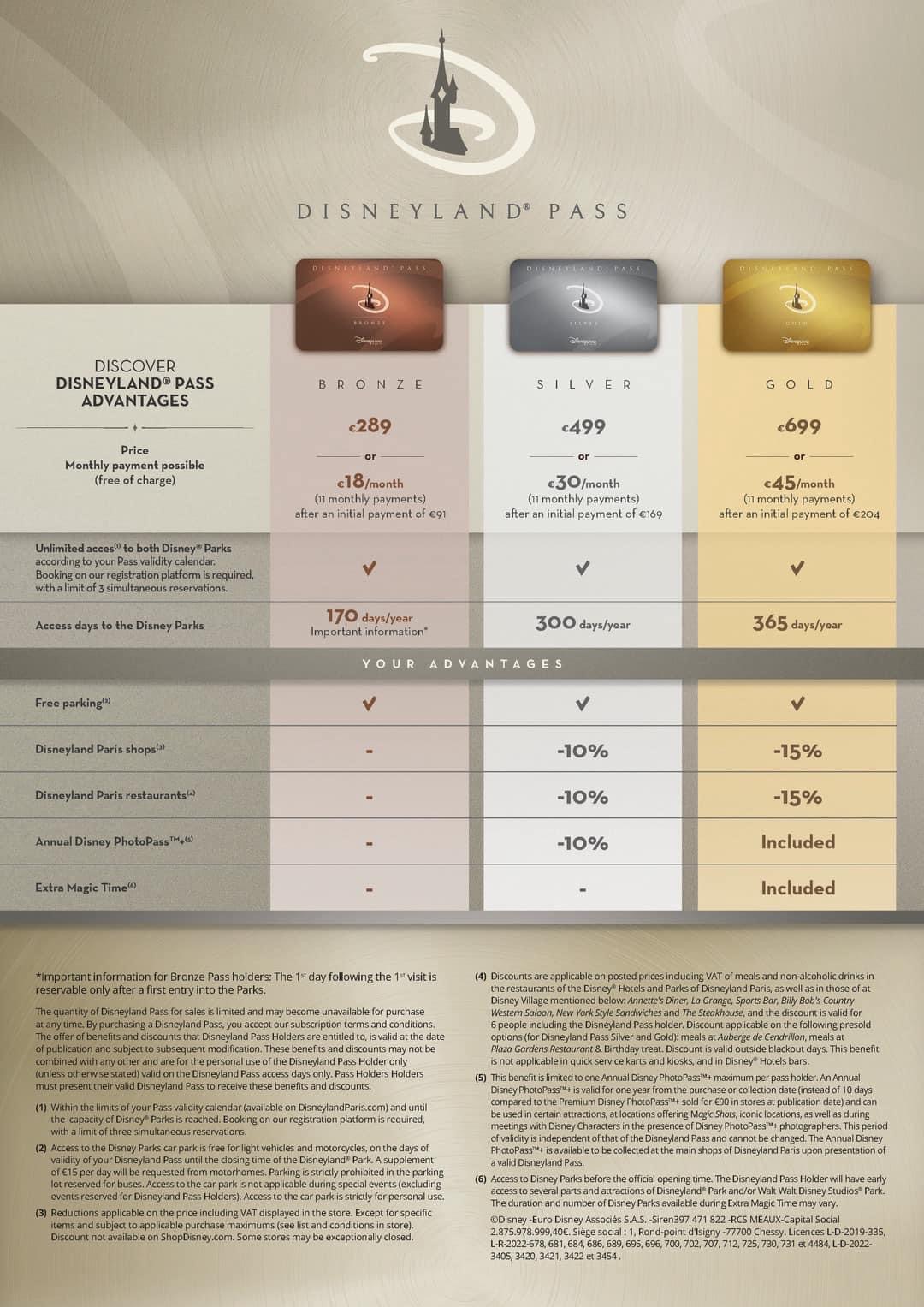 De nieuwe jaarpassen worden nu 'Disneyland Pass' genoemd en zijn beschikbaar in drie verschillende varianten: Bronze (€289), Silver (€499) en Gold (€699). De oude jaarkaarten Discovery, Magic Flex, Magic Plus en Infinity konden niet meer worden aangeschaft vanaf 30 maart 2023. Houders van deze jaarpassen konden hun passen wel verlengen met dezelfde voordelen, maar dit is niet meer mogelijk vanaf 11 juli 2023. Vanaf dan kunnen ze alleen nog upgraden naar de nieuwe versie.