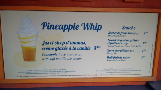 De Dole Whip wordt in Disneyland Parijs 'Pineapple Whip' genoemd en is een softijs, bestaande uit vanille roomijs, ananassap en siroop. De Pineapple Whip is sinds 4 juni 2016 te verkrijgen in een speciaal verkooppunt in Adventureland, naast de meet en greet locatie van Alladin.