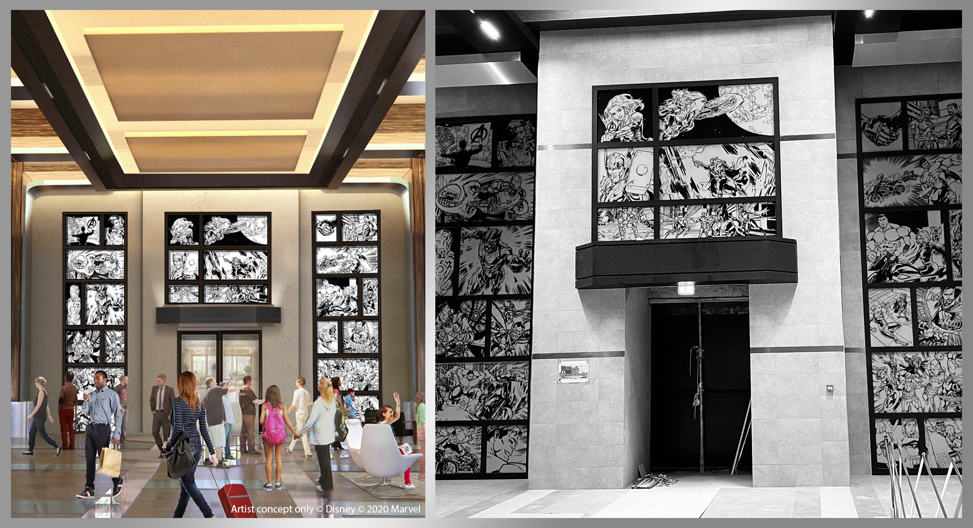 Op de foto is duidelijk te zien dat de concept art één op één is overgenomen tijdens de werken. In het interieur van de lobby zijn grote Marvel-kunstwerken te zien, waar de gasten van kunnen genieten zodra het hotel opengaat. Het vernieuwde viersterrenhotel is geïnspireerd op een kunstgalerie in New York, een eerbetoon aan de stad die de geboorteplaats was van de Marvel Super Heroes.