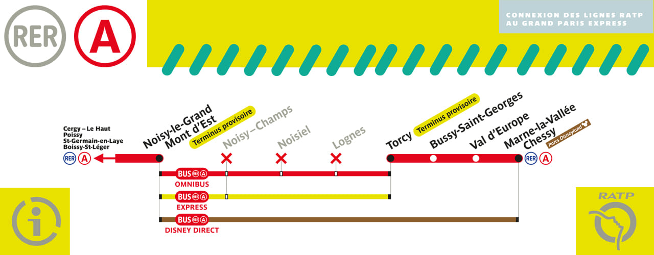 Om de hinder te beperken, zijn er voor de reizigers enkele bussen ingezet om de afstand te overbruggen. Elke 3 minuten zal er een omnibus rijden tussen beide stations. Deze stopt bij elke tussenstation. Je kan ook kiezen voor een expressbus die enkel bij het eindstation Torcy (of Noisy-le Grand Mont d'Est) stopt.