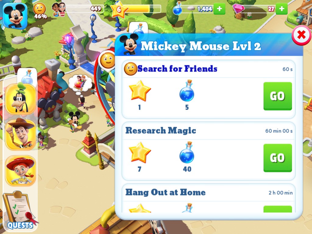 Magie en gems kan je verdienen door quests en activiteiten te doen. Elk personage heeft zijn eigen verhaallijn. Zo gaat Mickey Mouse op zoek naar Minnie Mouse, heeft Goofy altijd honger of probeert hij de vriendschap met Pete te verbeteren. Buzz Lightyear beschermt dan weer iedereen samen met Woody en Jessie zorgt voor de vrolijke toon.