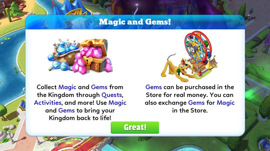 Om het spel te spelen heb je magie en gems nodig om personages bij te krijgen of te upgraden, maar ook om attracties, eetstandjes en decoraties aan te kopen of parades te laten starten. Je kiest zelf wanneer je dit doet, volledig op je eigen tempo.