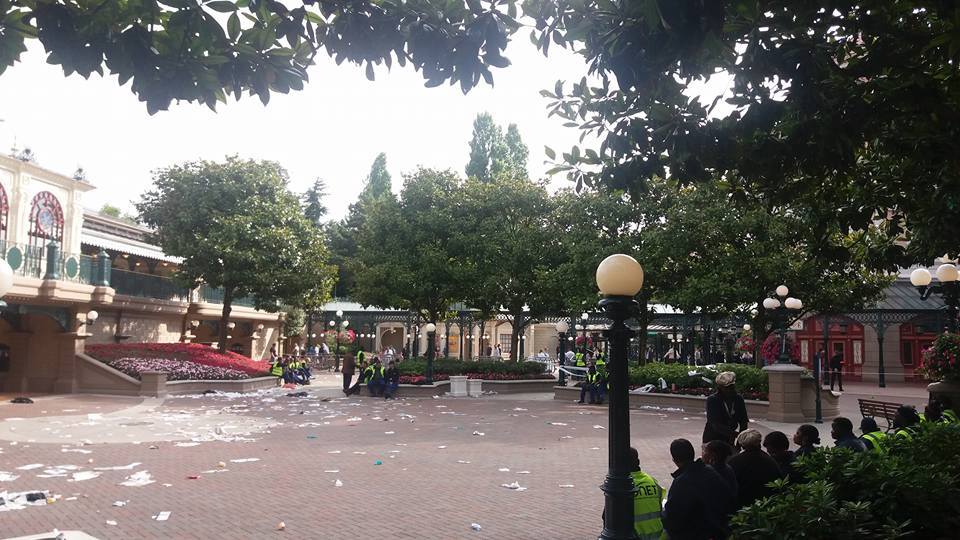 Door de staking lag het er maar vuil bij aan de ingang van het park. Niet echt de 'Disney experience' voor de gasten van het park. Noodgedwongen moest dan ook het entertainment dat zich normaal aan de ingang van het park bevindt, opschuiven naar het kasteel.
