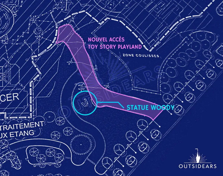 Momenteel heeft Toy Story Playland één grote ingang met een standbeeld van Buzz Lightyear. Er is nog de mogelijkheid om via Place de Rémy het land in te gaan door onder een brug te lopen. Binnenkort krijg het themaland dus een nieuwe, grote ingang die het gebied zal verbinden met de nieuwe promenade. Grote standbeelden van Woody en Jessy zullen aan de ingang staan, samen met de bekende, oversized lampen en Knex hekken.