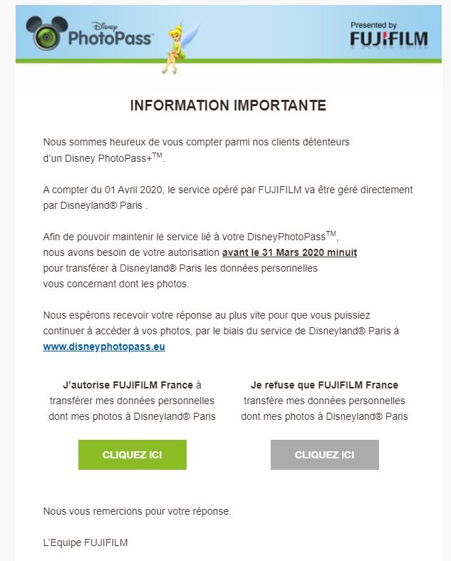 In de e-mail wordt gevraagd om je bestaande gegevens en foto's over te zetten naar je account van Disneyland Paris. Doe je dit niet, dan ben je jouw foto's onherroepelijk kwijt. Zelfs na je bezoek aan Disneyland Paris, kan je jouw foto's opvragen via de website https://www.disneyphotopass.eu. Met je foto's kan je allerlei producten bestellen zoals tassen, fotoalbums, kalenders en nog veel meer.