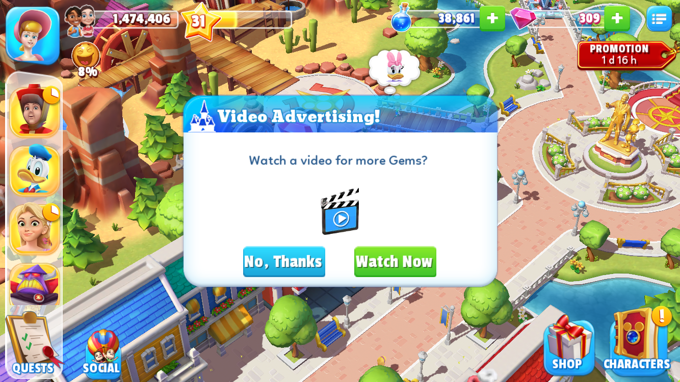 Game Loft, de makers van het spel, hebben nu een nieuwe methode toegevoegd om gems te verdienen. In Main Street staat er een gebouw dat een bioscoopzaal voorstelt. Hier verschijnt af en toe een ballon met een gem-symbool boven. Je hebt dan, tot 2x toe, de mogelijkheid om een reclame filmpje te bekijken dat ongeveer 15 seconden duurt. Na het bekijken van het filmpje hebt je 1 gem verdiend.