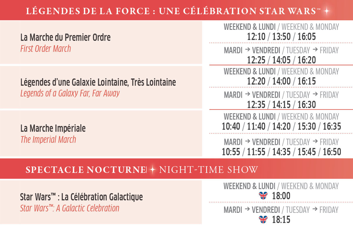 Doorheen de dag patrouilleren Stormtroopers door het park op zoek naar rebellen! Hou je hoofd koel. Tijdens de 'First Order March' aanschouw je de kracht van The First Order als Phasma met haar beste Stormtroopers door het park marcheert richting het podium op La Place des Stars.